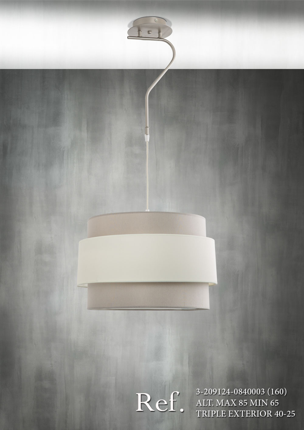 Colgante tubo de 10 con 1 luz (E-27) pintado en champan (C-2) y pantalla triple exterior (40-25) con tejido tierra/crema.
