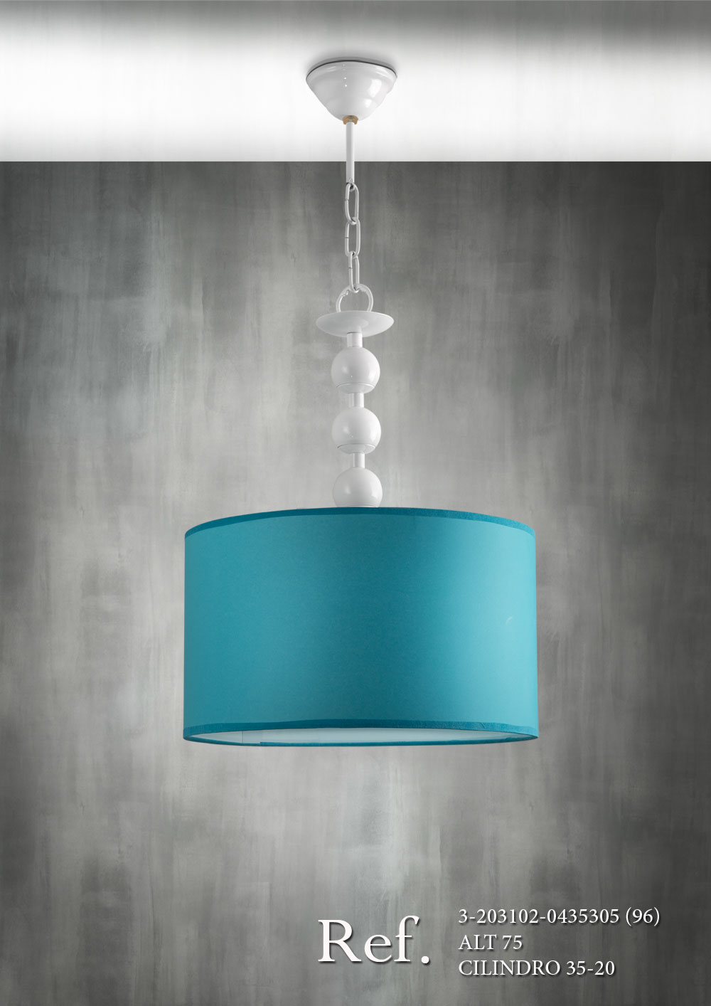 Colgante de tres bolas de 50 H. con 1 luz (E-27) pintado en blanco (C-1) y pantalla tubo redondo (35-20) con tejido turquesa.