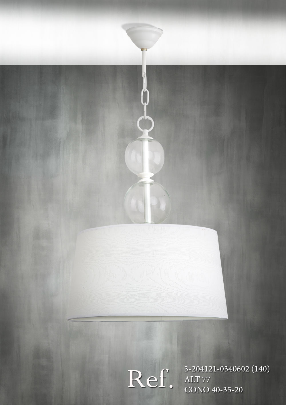 Colgante 2 bolas cristal transparente con 1 luz (E-27) pintado en blanco mate (C-1) y pantalla cono (40-35-20) con tejido blanco y grabado flores.