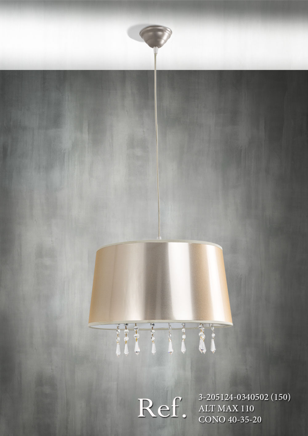 Colgante lgrimas y pendel hilo transparente con 1 luz (E-27) pintado en color champan (C-2) y pantalla cono (40-35-20) con tejido ancara oro.