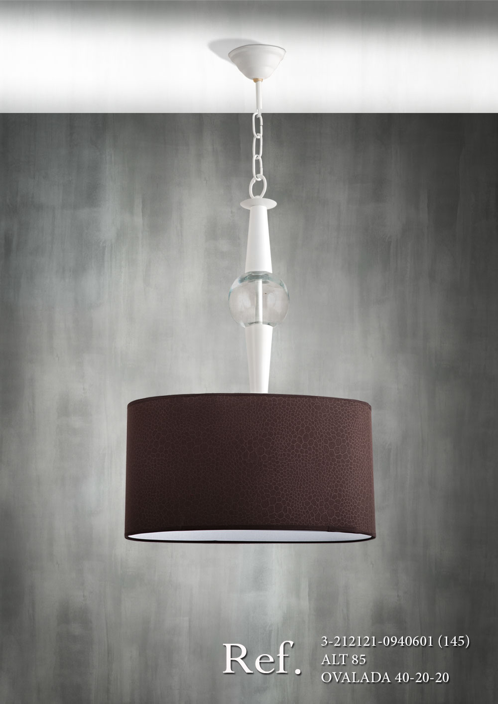 Colgante de conos y bola de cristal con 1 luz (E-27) pintado en blanco mate (C-1) y pantalla ovalada (40-20-20) con tejido marron grabado cocodrilo.