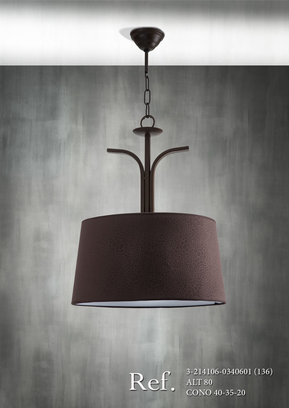 Colgante en forma de T de tubo 20x10 con 1 luz (E-27) pintado en marron oxido oscuro (C-1) y pantalla cono (40-35-20) con tejido marron grabado cocodrilo.