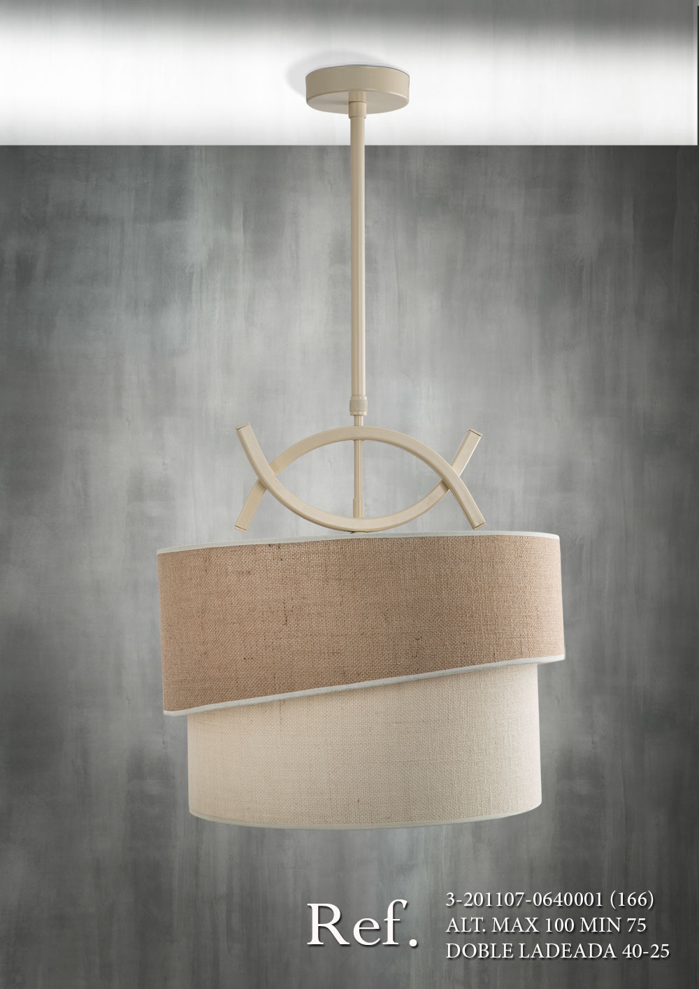 Colgante de tubo cuadrado extensible con 1 luz (E-27) pintado en crema liso (C-1) y pantalla doble ladeada (40-25) con tejido saco/ saco crema.