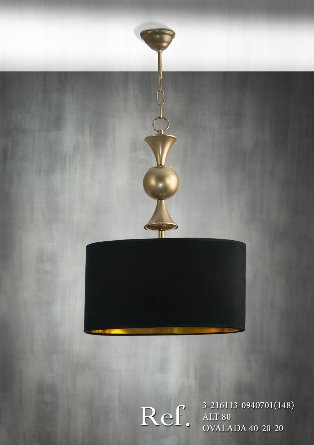 Colgante de trompeta y bola de hierro con 1 luz (E-27) pintado en color oro (C-1) y pantalla ovalada (40-20-40) con tejido negro/oro.