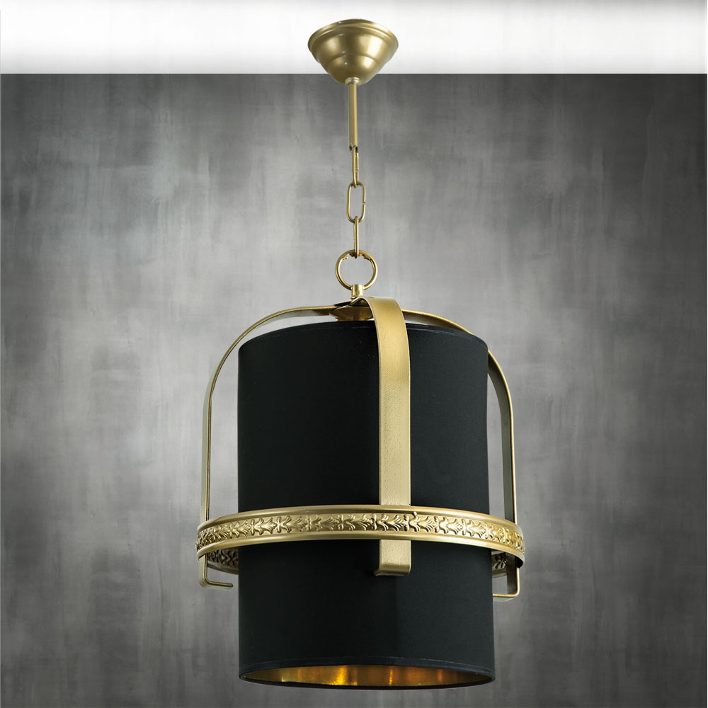 Colgante hilo de acero con 1 luz (E-27) pintado en oro y pantalla cono (60-50-50) en tejido negro/oro.